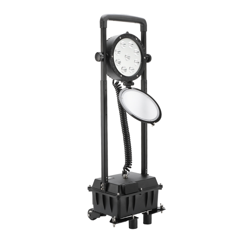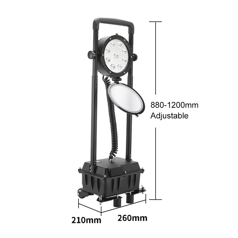 The Chinabozz 27W explosion-proof high-intensity work light is an industrial-grade lighting device designed for flammable and explosive high-risk environments. It features an explosion-proof + increased safety design, making it safe for use in hazardous locations such as petrochemical plants and coal mines. The integrated housing weighs only 8kg and comes with a pull rod and casters for easy carrying or dragging. The lamp post is adjustable from 0.9 to 1.2 meters, and the lamp head has multiple angles. It is equipped with 9 LEDs and a 27W power output, providing 3800lm of brightness. It supports focused floodlight switching and red/blue warning lights. The built-in 10Ah battery offers long-lasting power with low self-discharge and a long cycle life. The aluminum alloy body is corrosion-resistant, impact-resistant, rainproof, and durable. It includes a power display and USB emergency charging, making it suitable for emergency repairs and nighttime construction in military, railway, power, and fire departments.