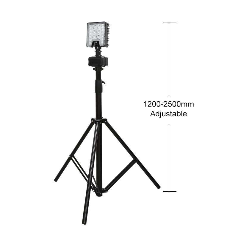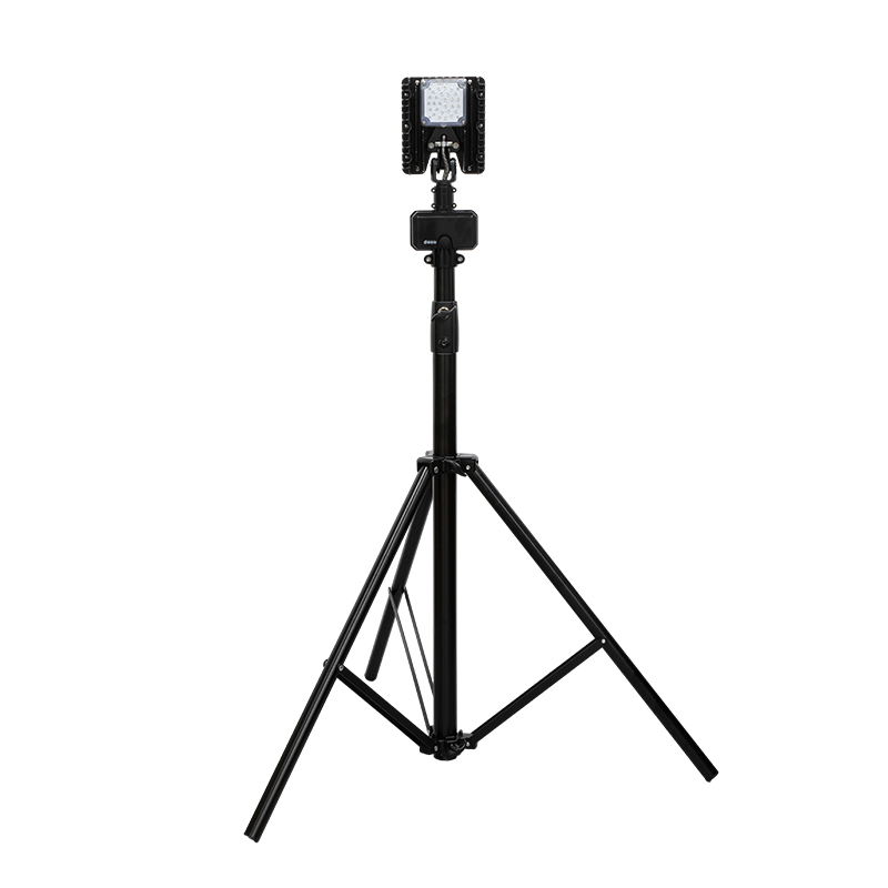The triangular bracket design ensures stable placement; the lamp post can be flexibly raised and lowered between 1.2 and 2.5 meters, and the lamp head is multi-angle adjustable for precise coverage of different work areas; the entire unit weighs 6.6 kg, and the lifting rod and battery box are integrated for portability and easy deployment.