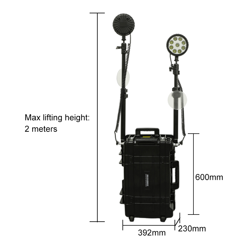 It adopts 2×27W high-power white LEDs, with a strong light luminous flux of 5500lm and a working light of 2200lm, and a light source life of up to 100,000 hours; equipped with a telescopic lifting pole, it can be raised up to 2 meters, and the lamp head can be adjusted 360° at will, with no blind spots and covering a large working area.